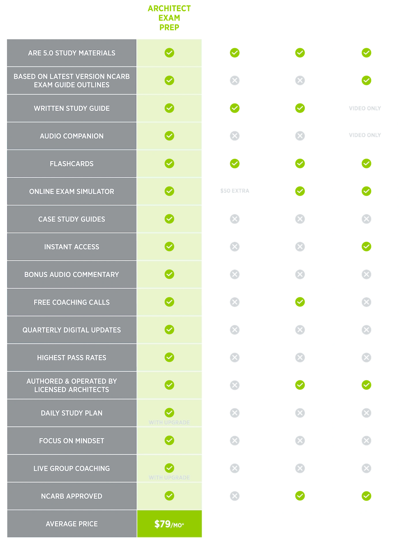 Similar to them, we were also NCARB Approved Test Prep Providers, we were the first to release guides for the ARE5.0 exams, and are trusted by half of the top 50 firms as their chosen study provider.