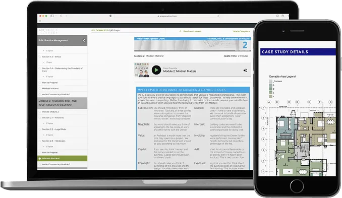 This includes 3 Months Access to Practice Management (PcM) access to the 2024 Online Architect Exam Prep bank of materials. You will have access to our exclusive Online Course Portal which consists of our study materials including, Online Study Guide, Audio Companion, Audio Commentaries, Online Flashcards, Online Case Study Guides (with 105 Case Study Questions), and Exam Simulator with a 295 Questions and Answers bank (245 Multiple Choice and 60 Case Study) with Feedback and No Feedback.